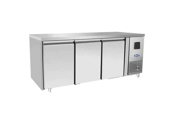 Kylskåpsbord med 3 dörrar tillverkat med bordsskiva i AISI304 och skåp i AISI201 rostfritt stål. Sidomonterad kompressor och automatisk avfrostning.