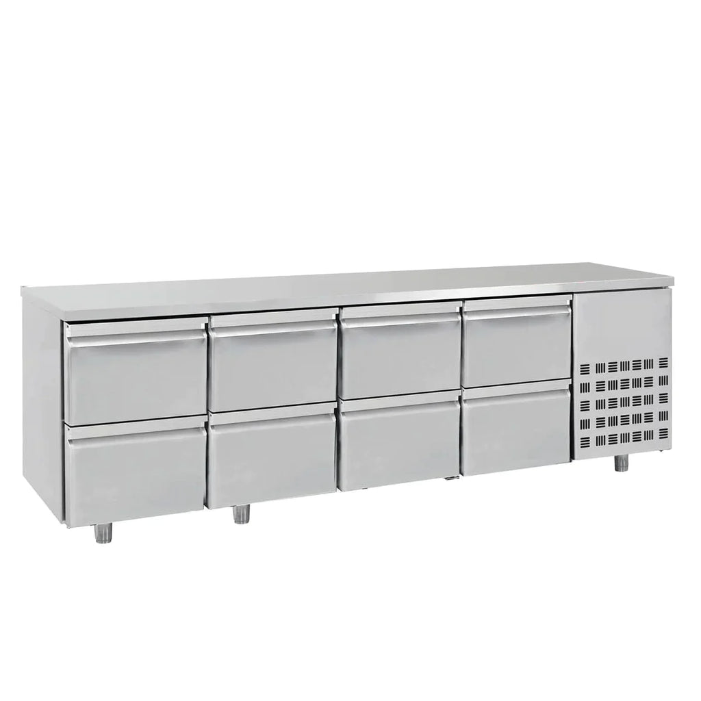 Kylskåpsbord med 8 lådor tillverkat med bordsskiva i AISI304 och skåp i AISI201 rostfritt stål. Sidomonterad kompressor och automatisk avfrostning. 2 års garanti på kompressordelen.