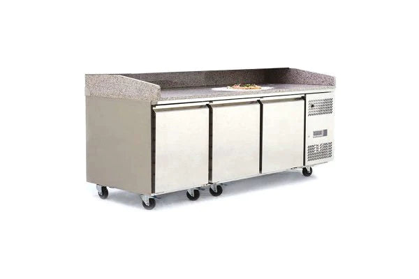 Pizzabänk i rostfritt stål med 3 dörrar och bordsskiva i granit. Sidomonterad kompressor. Självstängande dörr och magnetiska dörrtätningar. Levereras med hjul.